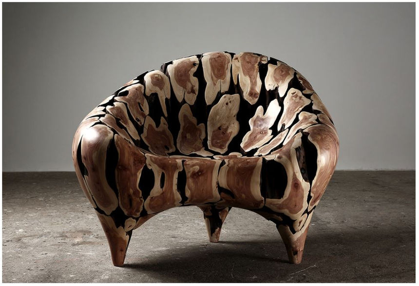 Table and chair showing cross-section of a tree and a sculpture made by bending a small nail gives us a familiar shape without changing the nature of the materials. Jaehyo Lee is success in a way how the natural materials come to our lives and creates an empathy.